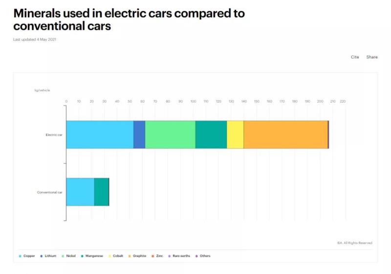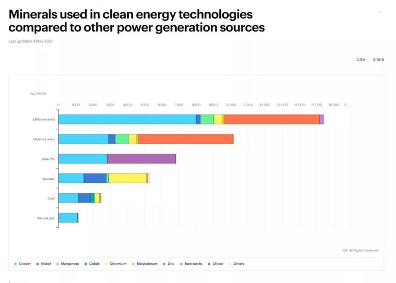 國際能源署發(fā)表報告指出,在向清潔能源過渡的過程中,關鍵礦物給能源安全帶來了新的挑戰(zhàn)??稍偕茉此褂玫牡V產資源類型因技術而異。鋰,鎳、鈷、錳和石墨對電池性能、壽命和能量密度至關重要。稀土元素對風力渦輪機、電動汽車發(fā)動機的永磁體至關重要。建設太陽能光伏發(fā)電廠、風力發(fā)電場、汽車(EV)通常需要比化石燃料更多的礦物質。一輛典型的電動汽車比傳統(tǒng)汽車需要6倍的礦物投入、陸上風力發(fā)電廠需要的礦物資源是燃氣發(fā)電的9倍。