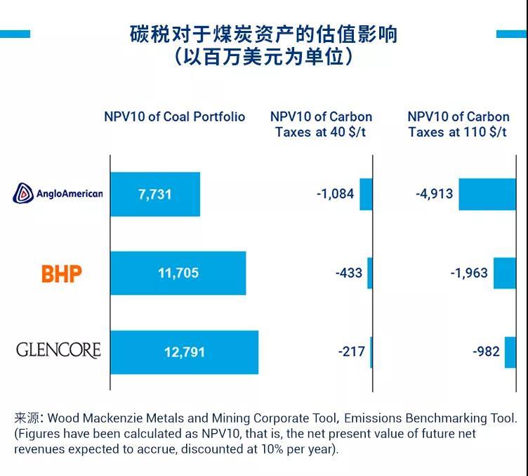 根據(jù)《巴黎協(xié)定》提出的將全球溫升控制在2度以內(nèi)的要求,預(yù)計(jì)到2030年各國碳價(jià)都將達(dá)到110美元/噸,而目前的基準(zhǔn)碳價(jià)為40美元/噸。提升碳價(jià)將對(duì)生產(chǎn)商和資產(chǎn)的影響各異。據(jù)伍德麥肯茲排放基準(zhǔn)工具顯示,下圖以煤炭為例,顯示了碳價(jià)對(duì)資產(chǎn)估值的重大影響。