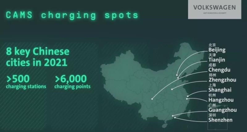 大眾集團認為,充電便利性和里程焦慮是當前阻礙中國客戶購買電動汽車的兩個主要因素。為此,大眾集團決定2021年借助合資公司開邁斯(CAMS),在中國布局超過500個充電站和6000多個充電樁,全面覆蓋北上廣深,以及天津、成都、鄭州、杭州這8個主要城市。