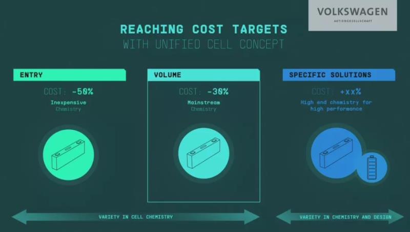 采用標準電芯可以有效降本。大眾集團CEO迪斯預計,標準電芯在量產(chǎn)車型中的成本將降低30%,在入門級車型中將降低50%。該公司的目標是將電池成本降低至每千瓦時100歐元以下。