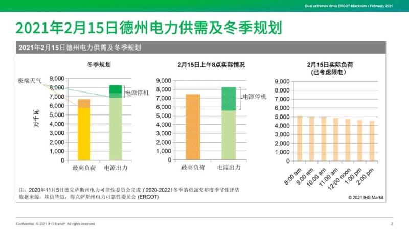 兩個并行的極端情況是造成此次停電危機(jī)的根本原因。第一,因寒潮來襲造成的電力需求增長遠(yuǎn)遠(yuǎn)超過電網(wǎng)預(yù)期。第二,寒流導(dǎo)致的冰凍使得發(fā)電設(shè)備無法出力達(dá)到了令人震驚的程度。此次極端天氣下無法運(yùn)行的發(fā)電設(shè)備容量幾乎是預(yù)估容量的兩倍。所以當(dāng)?shù)轮莸淖罡哓?fù)荷可能超過7,500萬千瓦(假如未采取切負(fù)荷步驟)的情況下,穩(wěn)定供電能力僅有6,800萬千瓦。整個電力供應(yīng)系統(tǒng)面臨崩潰的風(fēng)險。