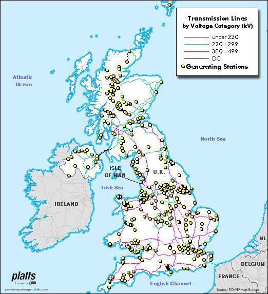 目前英國國家電網(wǎng)系統(tǒng)包含約7200公里的架空線、1400公里的地下電纜和約330個變電站。在英格蘭和威爾士有高壓輸電系統(tǒng),系統(tǒng)電壓為275kV和400kV。擁有2000MW英法輸電系統(tǒng)、1000MW BritNed英荷輸電系統(tǒng)兩條典型HVDC線路。