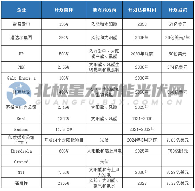 中國儲能網(wǎng)訊:隨著全球能源加速向低碳轉(zhuǎn)型,新能源行業(yè)爆發(fā)出的巨大潛力吸引了更多海外巨頭加碼布局,并陸續(xù)發(fā)布了未來5-10年布局新能源的規(guī)劃。據(jù)北極星太陽能光伏網(wǎng)不完全統(tǒng)計,自年初以來道達爾、BP、PKN、Galp Energía、杜克能源、Endesa、NTT等多個領(lǐng)域的巨頭發(fā)布了近590GW新能源裝機容量,累計超過1215億美元的投資計劃。
