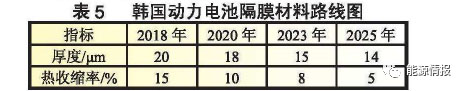 隔膜材料路線圖在隔膜的厚度和熱收縮率方面提出要求,到2025年隔膜的厚度將降低至14pm,熱收縮率降至5%。表5為韓國動力電池隔膜材料路線圖。