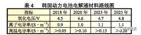 電解液路線圖提出要開發(fā)高電壓?穩(wěn)定性好的電解液材料,在氧化電壓?電導(dǎo)率方面設(shè)定目標,到2025年電解液的氧化電壓將達到4.8V。電導(dǎo)率δ(S/m),與電阻率ρ(Ω·m)呈倒數(shù)關(guān)系。表4為韓國動力電池電解液材料路線圖。