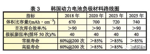負極材料路線圖提出要開發(fā)硅碳負極材料以及金屬系負極材料,改善循環(huán)壽命,到2025年負極的體積比容量將達到740mAh/cm3。表3為韓國動力電池負極材料路線圖。