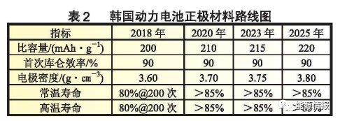 正極材料路線圖提出要開發(fā)能量密度高?穩(wěn)定性能好的正極材料,到2025年正極材料的比容量將達到220mAh/g。表2為韓國動力電池正極材料路線圖。