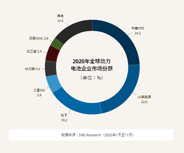 根據(jù)市場研究公司SNE Research發(fā)布的數(shù)據(jù),寧德時代是全球最大的動力電池供應商,在2020年前11個月中其市場份額為24.2%。LG化學則以22.6%的市場份額位居第二。