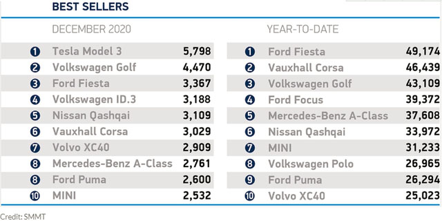 根據(jù)SMMT數(shù)據(jù),12月Model 3注冊量為5798輛,較排名第二的大眾高爾夫高出1328輛,而福特嘉年華是2020年全年英國銷量最高的車型,該月注冊量為3367輛,排名第三。