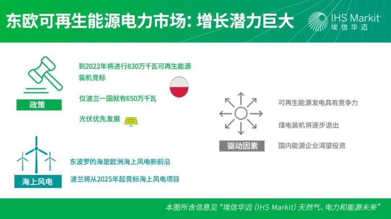 埃信華邁(IHS Markit)預(yù)計(jì),在政府激勵(lì)措施(如招標(biāo))的推動(dòng)下,東歐多個(gè)國家的可再生能源發(fā)電裝機(jī)都將超出預(yù)期目標(biāo)。預(yù)計(jì)未來一年半,克羅地亞、匈牙利和波蘭將有約830萬千瓦可再生能源項(xiàng)目招標(biāo),其中,波蘭約占650萬千瓦。