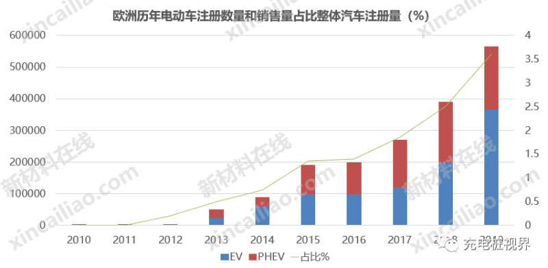 2019年歐洲電動汽車銷售份額為汽車市場的3.6%。2019年,歐盟和歐洲自由貿(mào)易協(xié)會成員電動汽車銷量為564,000臺。 2019年歐洲建設(shè)常規(guī)充電樁190,000個,快速充電中24,200個。