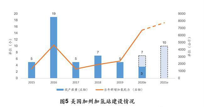 美國能源部的數(shù)據(jù)顯示,截止2020年11月21日,美國共建成46座商業(yè)化運營的加氫站,其中45座位于加利福尼亞州,除Newport Beach以外其余各站均正常運營。加州預計在今年年底前建成7座商業(yè)化加氫站,目前已完成3座,2021年規(guī)劃再建成10座。2018年9月加州燃料電池合作聯(lián)盟(CaFCP)發(fā)布的2030年遠景規(guī)劃中曾提出,到2030年加州將建成1000座加氫站,目前距離該目標還有很大差距。