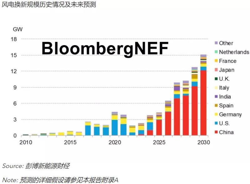 換新包括場(chǎng)內(nèi)風(fēng)機(jī)部件升級(jí)改造或完全換新。美國(guó)和德國(guó)的換新市場(chǎng)發(fā)展強(qiáng)勁,到2024年,換新規(guī)模預(yù)計(jì)增至近12GW。此后,中國(guó)風(fēng)機(jī)提前退役將再次掀起換新潮。