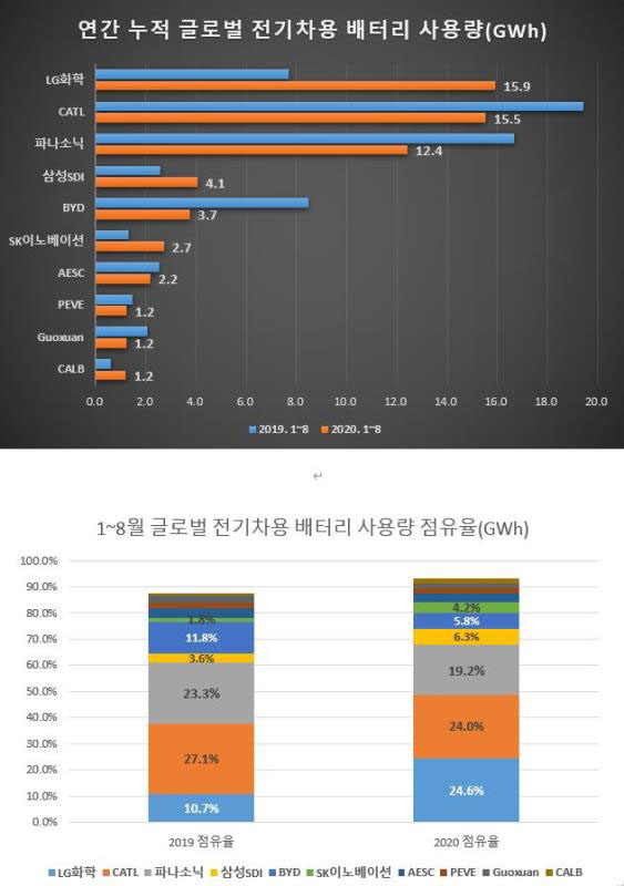 根據(jù)韓國(guó)調(diào)查機(jī)構(gòu)SNE Research的數(shù)據(jù),2020年1-8月全球動(dòng)力電池使用量較去年同期萎縮9.9%至64.7GWh,其中LG化學(xué)以24.6%(15.9GWh)的市占率居冠,寧德時(shí)代以24%(15.54GWh)的市占率緊追在后,松下以19.2%的市占率排第三,韓國(guó)三星SDI(6.3%)、比亞迪(5.8%)和韓國(guó)SK Innovation(4.2%)則順列第四至第六位。