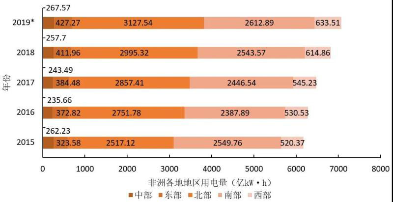 非洲用電量繼續(xù)保持平穩(wěn)增長(zhǎng)。2019年,非洲用電量為7069億kW?h,同比增長(zhǎng)3.6%,較上年降低1.7個(gè)百分點(diǎn),北部非洲增長(zhǎng)最快,同比增長(zhǎng)4.4%。用電量集中于北部和南部非洲,占比分別為44.2%和37.0%,西部、東部和中非非洲用電量占比分別9.0%、6.0%和3.9%。2015-2019年非洲各地區(qū)用電量如圖5所示。