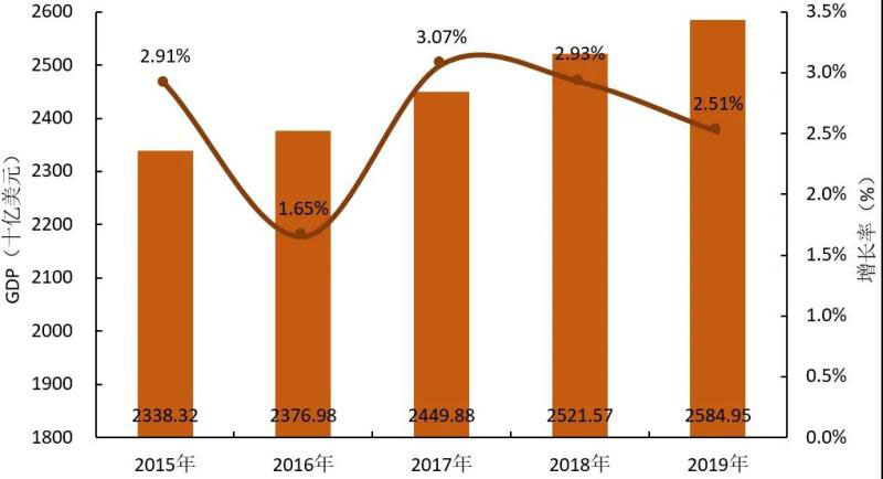 2019年,非洲經(jīng)濟(jì)總量接近2.6萬億美元,增速為2.5%。尼日利亞、南非和埃及GDP總量排在非洲前三。2015-2019年非洲GDP及其增長(zhǎng)率如圖1所示。