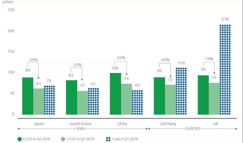 制約天然氣發(fā)電產(chǎn)業(yè)發(fā)展的首要因素是發(fā)電燃料成本高,影響到天然氣發(fā)電的優(yōu)勢。近年來,天然氣價(jià)格的下降趨勢使之與燃煤發(fā)電相比逐步具備了競爭力,這對亞洲的氣電發(fā)展至關(guān)重要,因?yàn)閬喼迋鹘y(tǒng)上是全球天然氣價(jià)格最高的地區(qū),且該地區(qū)的煤炭價(jià)格最低。2019年第一季度,日本和韓國天然氣發(fā)電的平準(zhǔn)化度電成本(LCOE)已低于燃煤發(fā)電。在中國,天然氣發(fā)電的LCOE仍高于燃煤發(fā)電,但兩者之間的差距縮?。ㄒ妶D3)。