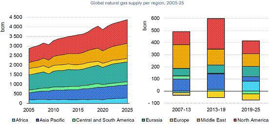 具體到各個(gè)地區(qū),IEA預(yù)測,到2025年,北美天然氣產(chǎn)量將以年均1.5%的速度增長,其中70%的產(chǎn)量增量源于美國的LNG出口。