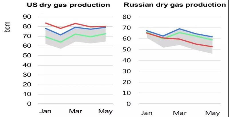 全球天然氣需求降低的影響并未完全在供應(yīng)側(cè)顯現(xiàn)。2020年前幾個(gè)月,與2019年同期相比,全球LNG供應(yīng)量、美國天然氣產(chǎn)量仍在增加,而俄羅斯天然氣產(chǎn)量卻有所下降。1~5月,盡管國內(nèi)天然氣需求下降,但是受出口貿(mào)易帶動(dòng),美國天然氣產(chǎn)量同比增長5.3%;由于對歐洲的管道天然氣出口量減少,以及供暖需求降低導(dǎo)致的國內(nèi)消費(fèi)量下降,俄羅斯天然氣產(chǎn)量同比下降9%。