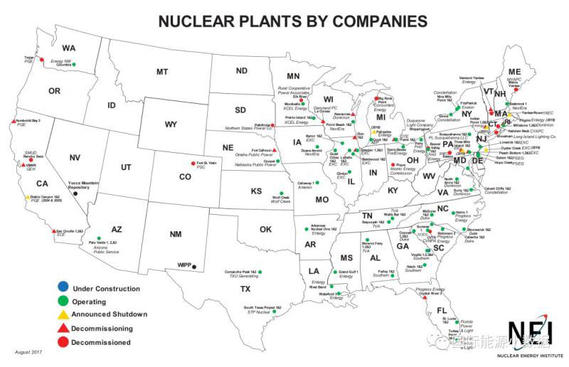 到目前為止美國(guó)共有61座核電廠,在運(yùn)核電機(jī)組99臺(tái)(平均年齡39歲),分布在30個(gè)州。從下圖可見,超過一半的機(jī)組屬于“內(nèi)陸”。美國(guó)核電裝機(jī)核電裝機(jī)99吉瓦,占發(fā)電裝機(jī)的9%,但發(fā)電量(7970億度)占20%。