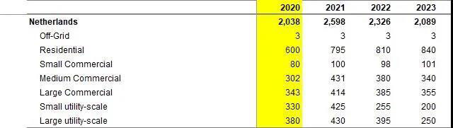 荷蘭市場上半年的表現(xiàn)比較穩(wěn)定,根據(jù)分析機(jī)構(gòu)預(yù)測,2020年荷蘭將持續(xù)新增光伏裝機(jī)2.02GW,其中屋頂系統(tǒng)占比最大,約為600MW,工商業(yè)分布式和公共事業(yè)項(xiàng)目將新增1.35GW。