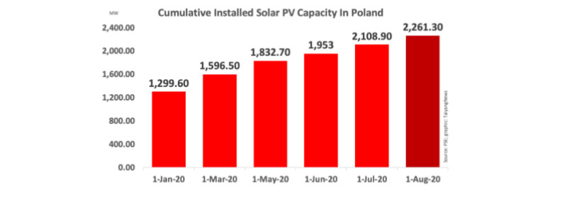 波蘭電網(wǎng)PSE的數(shù)據(jù)顯示,到2020年8月1日,波蘭的累計(jì)安裝和并網(wǎng)太陽能光伏發(fā)電量達(dá)到2,261.347 MW。其中,前六個月新增光伏809MW。七月份安裝了超過152MW的光伏,波蘭可再生能源研究所(IEO)表示,該國到2020年底可達(dá)到2.5 GW的累計(jì)裝機(jī)容量,到2025年,這一數(shù)據(jù)有望增至7.8 GW。