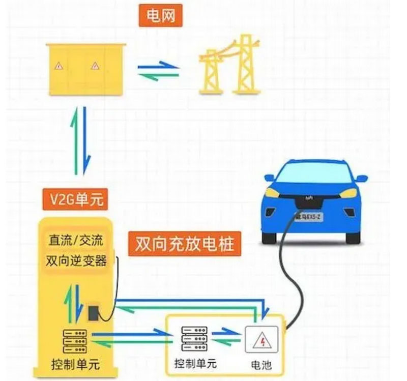 從國家電網(wǎng)的角度,V2G可以起到調(diào)節(jié)電網(wǎng)的作用 —— 在用電高峰期讓電動(dòng)汽車向電網(wǎng)放電,在用電低谷時(shí)給車輛充電,減輕電網(wǎng)的負(fù)載壓力。