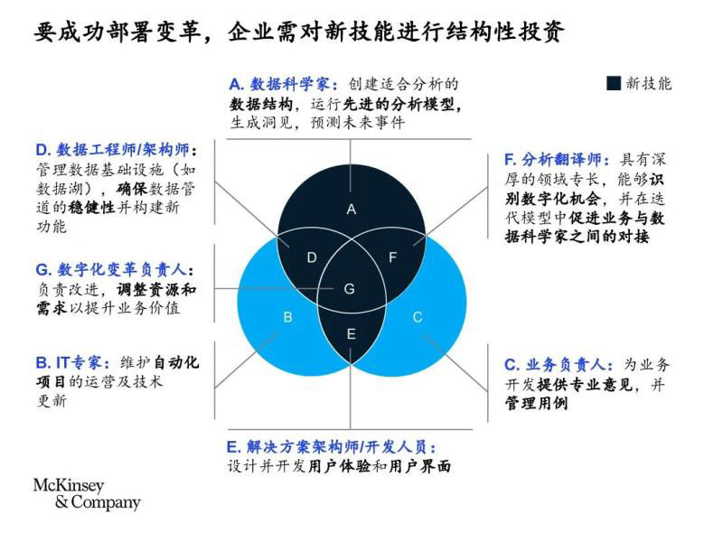 企業(yè)需要有人來管理機器、運行控制塔和數(shù)字孿生。他們希望員工能夠進行數(shù)字化績效管理,解讀從車間成千上萬個傳感器中提取的數(shù)據(jù)、找到提高產(chǎn)量的方法,并得出可落地的洞見。企業(yè)需要更多的IT人員來開發(fā)可訪問海量數(shù)據(jù)的應(yīng)用程序。除去數(shù)據(jù)科學(xué)家、數(shù)據(jù)工程師和技術(shù)領(lǐng)導(dǎo)人員外,企業(yè)還需要招募各個領(lǐng)域的專家、數(shù)字和分析翻譯人員,以及產(chǎn)品負責(zé)人。產(chǎn)品負責(zé)人會與業(yè)務(wù)和職能領(lǐng)導(dǎo)層,以及數(shù)據(jù)和技術(shù)專家組成的團隊進行商討,識別問題并開發(fā)最合適的數(shù)字解決方案(見下圖)。價值鏈的其他環(huán)節(jié)也必須展開再培訓(xùn):比如,企業(yè)可能需要在采購部門招攬更多的成本工程師,使用成本建模工具來評估設(shè)備和采購成本。