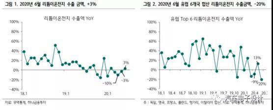 在韓國的證券報告里面,我找到了這樣的圖,有關于韓國二次電池出口的數(shù)據(jù)概覽,6月韓國二次電池出口量同比增長3%,已經(jīng)讀過了最近你的時期,之前在4月-10%,5月-3%。右邊這張圖可以看到歐洲主要的六個國家的出口合計同比增長是-20%,從5月的13%往下拉,而出口到波蘭汽車OEM密集區(qū)域的地方,同比下降了-82%。