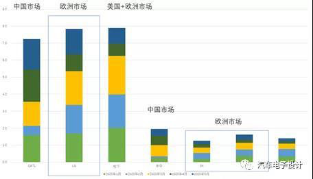 實際上,這里代表了不同市場的需求問題,2020年1-5月,按地區(qū)來劃分來看,電動汽車的銷售量,歐洲超過44%,中國37%,美國13%,世界上其他地區(qū)銷量占6%。歐洲最主要是由五個國家(德國、法國、英國、挪威和瑞典,今年荷蘭掉隊了)驅(qū)動的,占到了歐洲銷量的70%,6月份著五個國家的銷量加起來有67496臺。所以這里折射出來的,當前在2020年歐洲的快速增長把電池的需求量的份額帶起來,LG所覆蓋的雷諾、奧迪、沃爾沃、捷豹、Smart和現(xiàn)代,SDI覆蓋的大眾、寶馬,SK覆蓋的奔馳和起亞。今年中國市場的需求,在合資企業(yè)沒有真正上量把蛋糕做起來之前,是出現(xiàn)階段性困難的。
