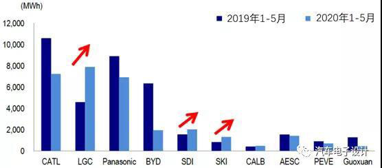 2020年1-5月份全球新能源汽車動力電池的總裝機量為32.5 GWh ,與去年同期相比下降23.9%。今年三家韓國電池公司的安裝量以兩位數(shù)增長,其市場份額從一年前的 16.4%增長到34. 8%。LG 化學安裝量增長70.5%,達到7.8 GWh,從去年同期的第四位躍居第一;三星SDI 2.1GWh,增長了 33.4%排名第四(超過了比亞迪);SK Innovation 增長59.6%至 1.3 GWh。