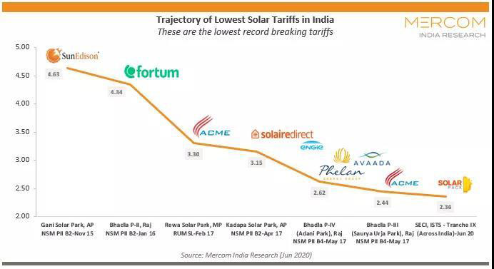 近日,印度太陽(yáng)能公司(soar Energy Corporation of India)2吉瓦光伏項(xiàng)目競(jìng)標(biāo)創(chuàng)下歷史新低,來自西班牙的Solarpack公司報(bào)價(jià)為2.36盧比(約合3.13美分/kWh),這此前最低報(bào)價(jià)2.44盧比(約合3.2美分/kWh)低了約3.3%。