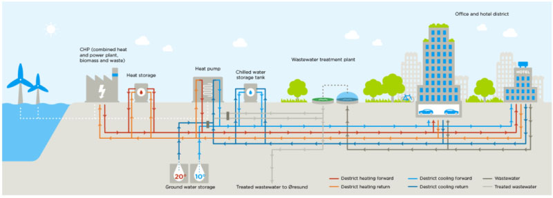 位于大哥本哈根郊區(qū)塔恩比市(Taarnby)卡斯特魯普地鐵站的新城市開(kāi)發(fā)區(qū),是使用智能耦合的很好例子,首次將區(qū)域供熱與區(qū)域冷卻和廢水結(jié)合起來(lái),為該地區(qū)的社區(qū)和商業(yè)部門(mén)提供低碳能源。塔恩比公用事業(yè)公司建立了一個(gè)新的區(qū)域供冷系統(tǒng),并擴(kuò)建了現(xiàn)有的區(qū)域供暖系統(tǒng),以取代燃?xì)忮仩t。新的區(qū)域供冷系統(tǒng)包括一個(gè)能源站和一個(gè)2000立方米的冷凍水儲(chǔ)罐。能源站位于污水處理廠(chǎng)的外圍,可以實(shí)現(xiàn)熱電聯(lián)產(chǎn),有4臺(tái)熱泵從處理后的污水中提取額外熱量。