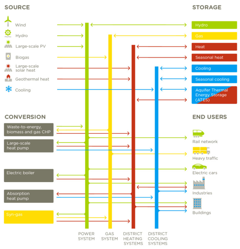 Ramboll公司發(fā)文介紹,能源系統(tǒng)由四個(gè)能源載體組成:電力系統(tǒng)、燃?xì)饩W(wǎng)絡(luò)、區(qū)域供熱網(wǎng)絡(luò)和區(qū)域冷卻網(wǎng)絡(luò)。傳統(tǒng)上,這四個(gè)能量載體是分開(kāi)運(yùn)行的。然而,在綠色能源比例不斷增加的情況下,將四種能源載體的各個(gè)要素連接起來(lái)并利用它們各自的優(yōu)勢(shì),可以建立起能源系統(tǒng)所需的靈活性。在未來(lái)的能源系統(tǒng)中,以智能耦合打通四大能源載體,可提供更清潔、更廉價(jià)的能源服務(wù)。