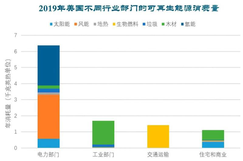 可再生能源也用于工業(yè)(21.7%)、交通(12.2%)、住宅(7.3%)和商業(yè)(2.5%)部門。生物質(zhì),包括木材、生物廢料和生物燃料,在每個(gè)部門都有消費(fèi);木材以及生產(chǎn)生物燃料的副產(chǎn)品主要用于工業(yè)部門;燃料乙醇、生物柴油和可再生柴油等生物燃料主要用于交通部門;木材、廢物垃圾、太陽能和地?zé)岫嘤糜谧≌蜕虡I(yè)部門。