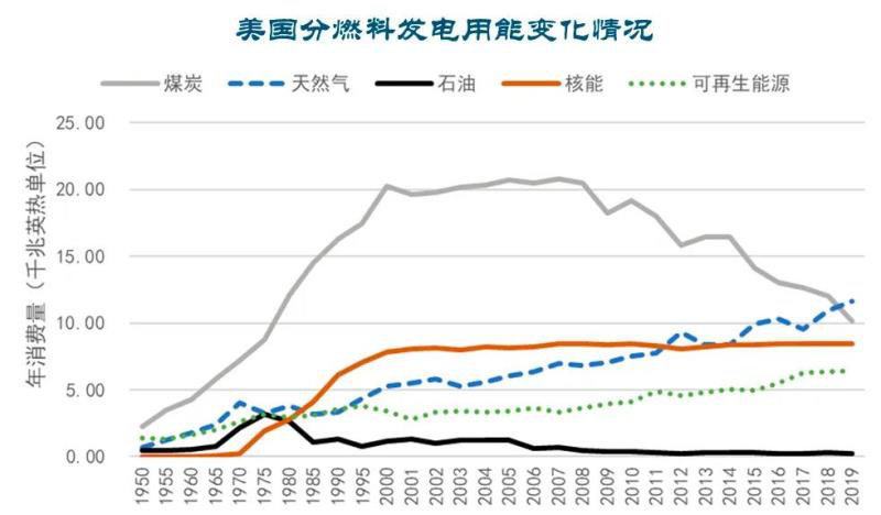 2019年,美國煤炭消費(fèi)量從2007年的22.7千兆英熱單位降低50%至11.3千兆英熱單位,已接近1964年的用煤量水平。煤炭在美國一次能源中的占比也由2007年的22.5%降至2019年的11.3%。