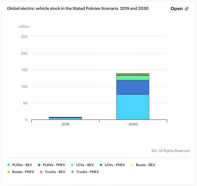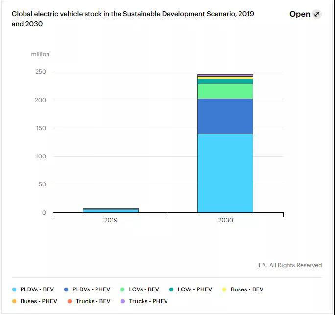根據(jù)《報告》,未來十年,在既定政策下,全球電動汽車保有量接近1.4億輛,占全球汽車保有量的7%;但在“可持續(xù)發(fā)展情景”下,全球電動汽車保有量預計每年將增長36%,到2030年,達到2.45億輛,即目前水平的30多倍,其中,輕型車市場增長將最為強勁。