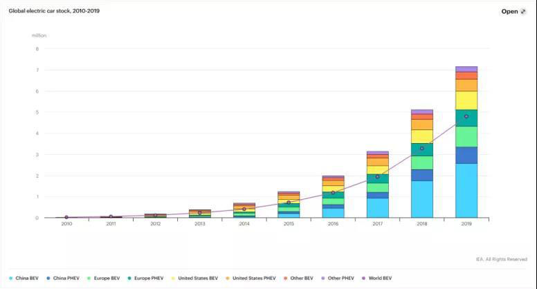 IEA指出,在過去十年間,全球電動汽車在政策和技術(shù)進步的支持下大幅擴張。2010年,全球電動汽車保有量僅有約17000輛,到2019年,這一數(shù)字已增至720萬。其中,中國占47%,另有9個國家保有量超過10萬輛,至少20個國家的電動汽車市場份額超過1%。