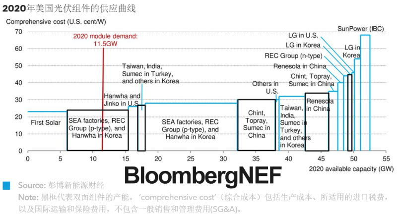 BNEF預計2020年可供應美國市場的雙面組件產(chǎn)能將達到20.5GW,其中9.4GW的雙面組件平均生產(chǎn)成本為22美分/瓦。大型廠商今年下半年可將組件生產(chǎn)成本壓低至18美分/瓦。由于普遍性供過于求,在豁免關稅的情況下,雙面組件價格有可能降至23美分/瓦,這個價格在涵蓋所有非生產(chǎn)性支出的情況下,可保證4%的凈利潤率。