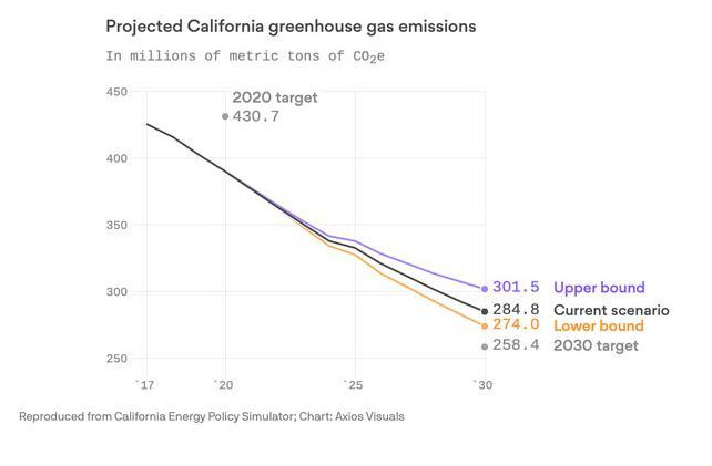 2017年,加州政府頒布州法AB 398,提出了美國(guó)最激進(jìn)的減排目標(biāo);計(jì)劃到2030年將溫室氣體排放量在1990年水平上減少40%,到2050年實(shí)現(xiàn)溫室氣體比1990年減少80%。這意味著加州2030年二氧化碳排放量將從2017年的4.24億噸急劇減少到2.58億噸。