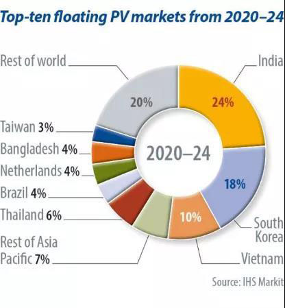 IHS Markit預(yù)計(jì),在在未來(lái)5年,亞洲將占到漂浮電站裝機(jī)總數(shù)的70%以上。其中,預(yù)計(jì)最大的三個(gè)市場(chǎng)將是印度、韓國(guó)和越南。如果開(kāi)發(fā)和并網(wǎng)持續(xù)按計(jì)劃進(jìn)行,這三個(gè)國(guó)家的裝機(jī)容量將占到總裝機(jī)容量的一半以上。