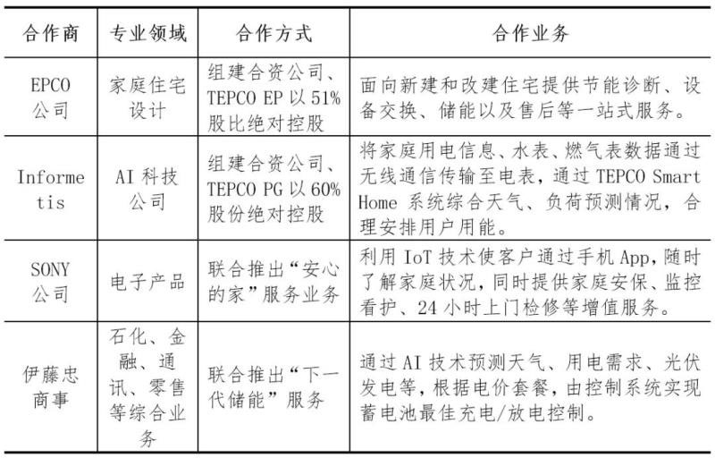 對于商業(yè)發(fā)展前景較好的業(yè)務(wù),東京電力大多與具備技術(shù)優(yōu)勢的合作方組建合資公司,開展專業(yè)化運營,東京電力積極爭取控股。由TEPCO EP絕對控股,與家庭住宅設(shè)計領(lǐng)域上市公司EPCO組建合資公司,借助EPCO成熟物聯(lián)網(wǎng)平臺和智慧家庭技術(shù),開展住宅節(jié)能診斷、設(shè)備交換、儲能以及售后等一站式服務(wù),2018年預(yù)計該合資公司銷售額約4.86億元人民幣。由TEPCO PG絕對控股,與科技公司Informetis組建合資公司,依托Informetis基于能源物聯(lián)網(wǎng)的大數(shù)據(jù)分析、非入戶式分離技術(shù)等,開展家庭用能信息收集、分析、用電方案優(yōu)化業(yè)務(wù),相關(guān)數(shù)據(jù)同時出售給房產(chǎn)、安保、保險、醫(yī)護(hù)服務(wù)公司等進(jìn)行變現(xiàn)。