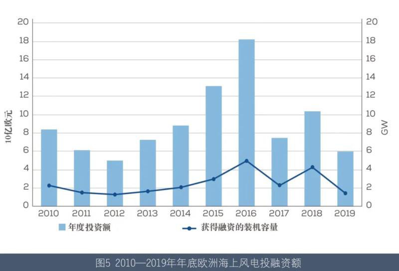 2019 年,歐洲海上風(fēng)電新增投資60 億歐元(約合人民幣462.42 億元),比2018 年減少了40%??紤]到每年達(dá)成最終投資決策(FID)的大型海上風(fēng)電場(chǎng)數(shù)量較少,且國(guó)家間投資框架存在差異,該數(shù)據(jù)會(huì)逐年波動(dòng)。