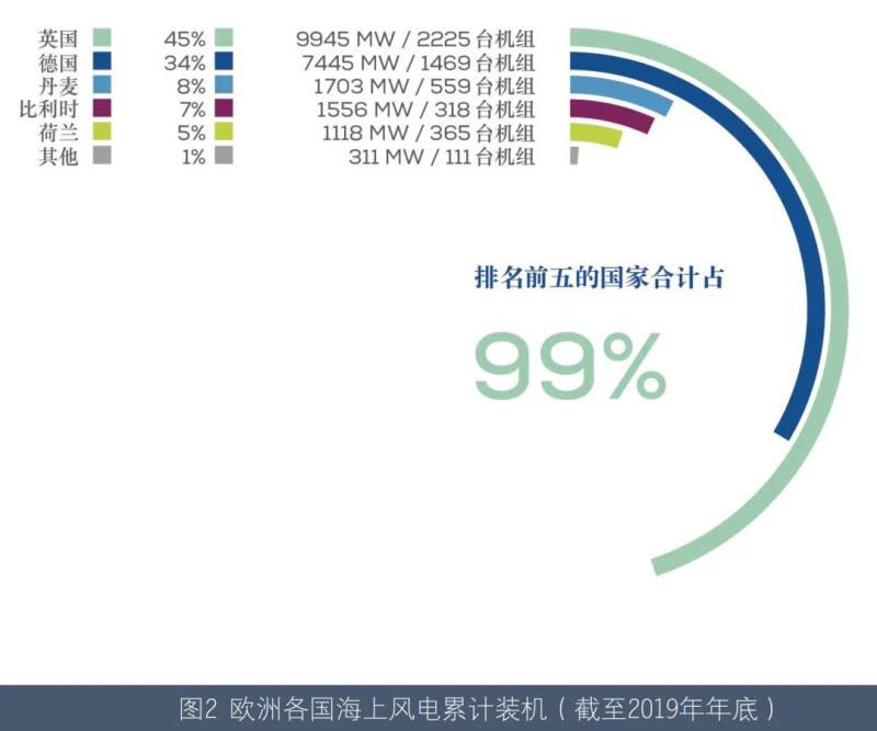 截至2019 年年底,歐洲共安裝5047 臺(tái)海上風(fēng)電機(jī)組,累計(jì)裝機(jī)容量為22072MW。排名前五的國(guó)家所占份額達(dá)99%,分別是英國(guó)(45%)、德國(guó)(34%)、丹麥(8%)、比利時(shí)(7%)和荷蘭(5%)。
