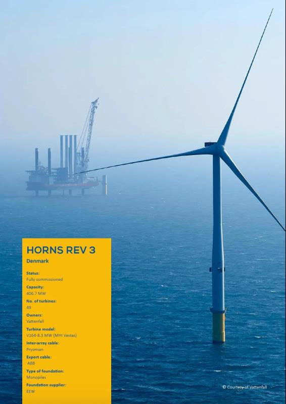 2019 年,丹麥的海上風(fēng)電新增并網(wǎng)容量達(dá)到創(chuàng)紀(jì)錄的374MW,占全歐洲的10%。該國(guó)最大的海上風(fēng)電場(chǎng)Horns Rev 3 的總裝機(jī)容量為407MW,目前已全部并網(wǎng)。