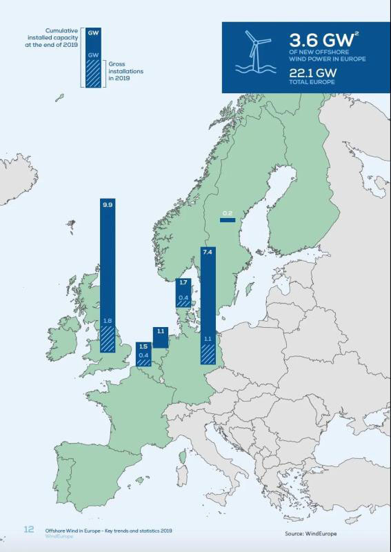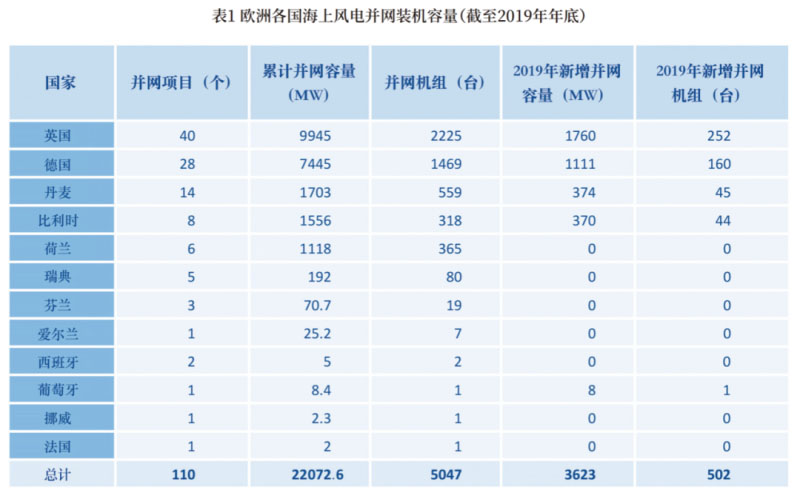 2019 年,歐洲海上風(fēng)電新增并網(wǎng)容量3623MW,增加502 臺(tái)海上風(fēng)電機(jī)組(凈新增裝機(jī)容量3627MW),涉及10 個(gè)風(fēng)電場(chǎng)。截至2019年年底,歐洲海上風(fēng)電累計(jì)裝機(jī)容量為22072MW,共有5047 臺(tái)風(fēng)電機(jī)組并網(wǎng),分布于12 個(gè)國(guó)家。另外,英國(guó)拆除了2臺(tái)2MW機(jī)組。