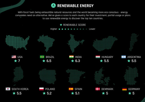 近日,英國商業(yè)能源在一項研究中,對29個國家從投資到可再生能源的使用情況進行了評分,選出了前十名。其中,美國作為世界上最大的能源經(jīng)濟體以7分排名第一,巴西緊隨其后排名第二,得分為6.5分;印度排名第三,得分為6.3分;其余依次為匈牙利(5.5)、阿根廷(5.5)、韓國(5.5)、波蘭(5.2)、西班牙(5.1)、丹麥(5)、德國(5.5)。