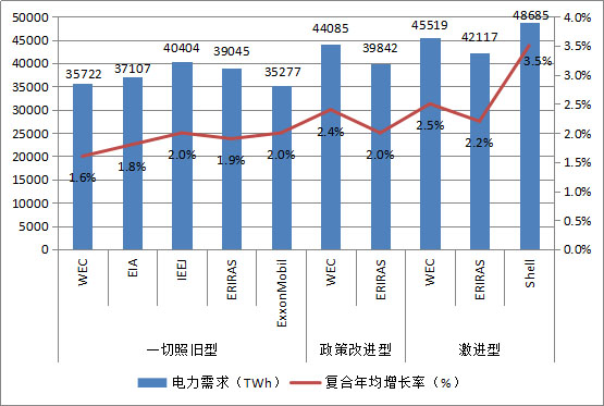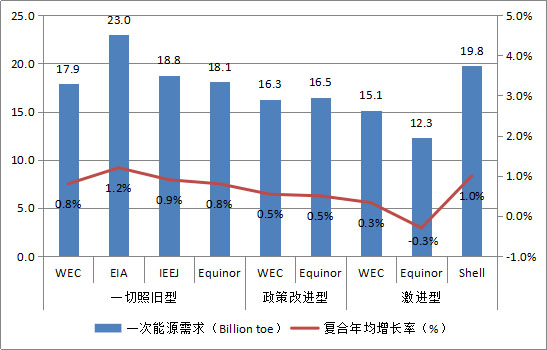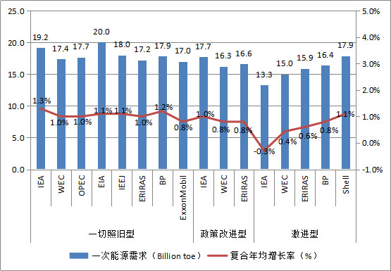 在政策改進型預測中,WEC現(xiàn)代爵士樂情景和ERIRAS創(chuàng)新情景認為全球一次能源需求在160億噸~170億噸油當量之間,年均增長0.8%,IEA既定政策情景則認為一次能源需求將超過170億噸油當量,年均增長1.0%,幾乎與其他機構(gòu)的一切照舊型預測相當,從這一角度講,有專家認為,IEA的預測過于保守。