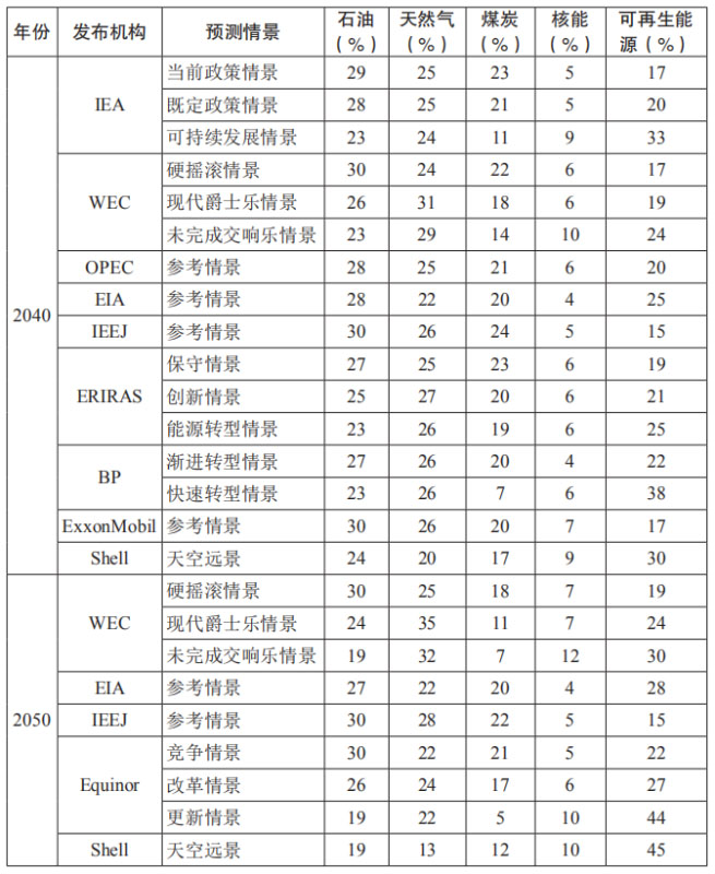 表2 各機構(gòu)全球一次能源結(jié)構(gòu)預測
