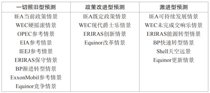上述各機構(gòu)展望中設置的情景可以歸為三類:一是中規(guī)中矩、保持現(xiàn)行趨勢的一切照舊型預測,包括IEA當前政策情景、WEC硬搖滾情景、OPEC參考情景、EIA參考情景、IEEJ參考情景、ERIRAS保守情景、BP漸進轉(zhuǎn)型情景、ExxonMobil參考情景、Equinor競爭情景等;二是技術(shù)進步和政策調(diào)整情況下的政策改進型預測,包括IEA既定政策情景、WEC現(xiàn)代爵士樂情景、ERIRAS創(chuàng)新情景、Equinor改革情景等;三是為應對氣候變化而制定嚴格氣候政策,進而導致能源行業(yè)迅速轉(zhuǎn)型的激進型預測,包括IEA可持續(xù)發(fā)展情景、WEC未完成交響樂情景、ERIRAS能源轉(zhuǎn)型情景、BP快速轉(zhuǎn)型情景、Shell天空遠景、Equinor更新情景等(見表1)。